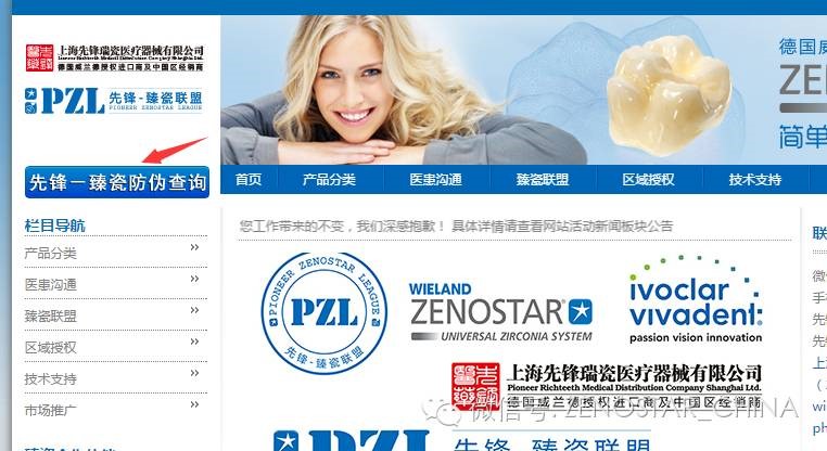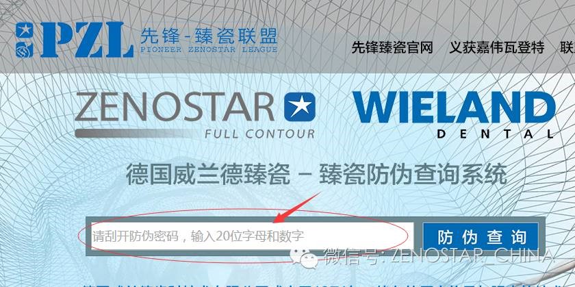 第二:打開威蘭德中文網(wǎng)http://www.zenostar.com.cn/,點擊左上方先鋒-臻瓷防偽查詢?nèi)缦聢D所示: